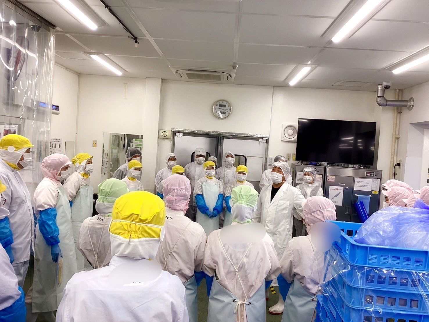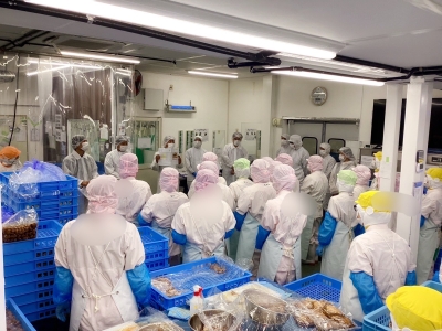 グローフーズの製造現場ではベトナム人の方も活躍しているのですが、朝礼で「日本文化とベトナム文化の違い」「日本語が分からないことで発生する問題」などをコント仕立てにして、分かりやすく説明している様子を撮影していただきました。