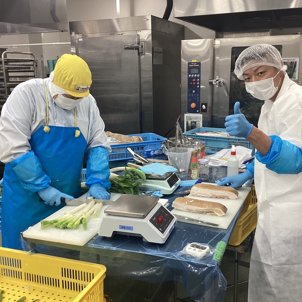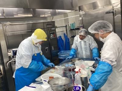 総料理長・料理長に細部まで確認していただきながら、実際の製造工程を一つひとつ見ていただき、計4品のおかずを共同で仕上げました。