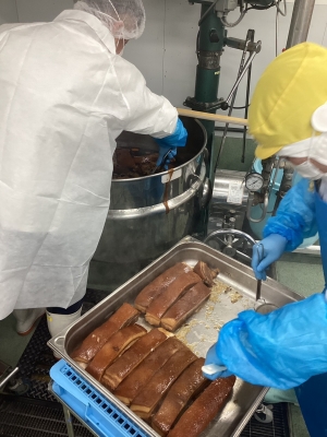 ホテル日航熊本の総料理長・料理長をグローフーズにお招きし、おせちに盛り込むオリジナルレシピのおかずを、弊社コックとともに3日間かけて製造いたしました。