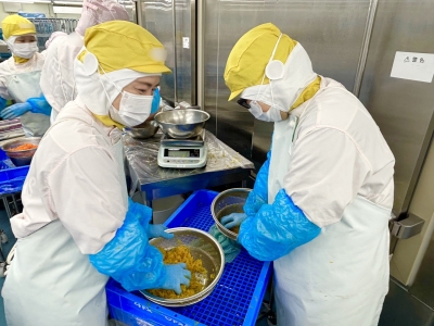 今月は毎日、巻きずしの具材となる「巻き芯」の部分を、レーンで盛り込む作業を行っています。